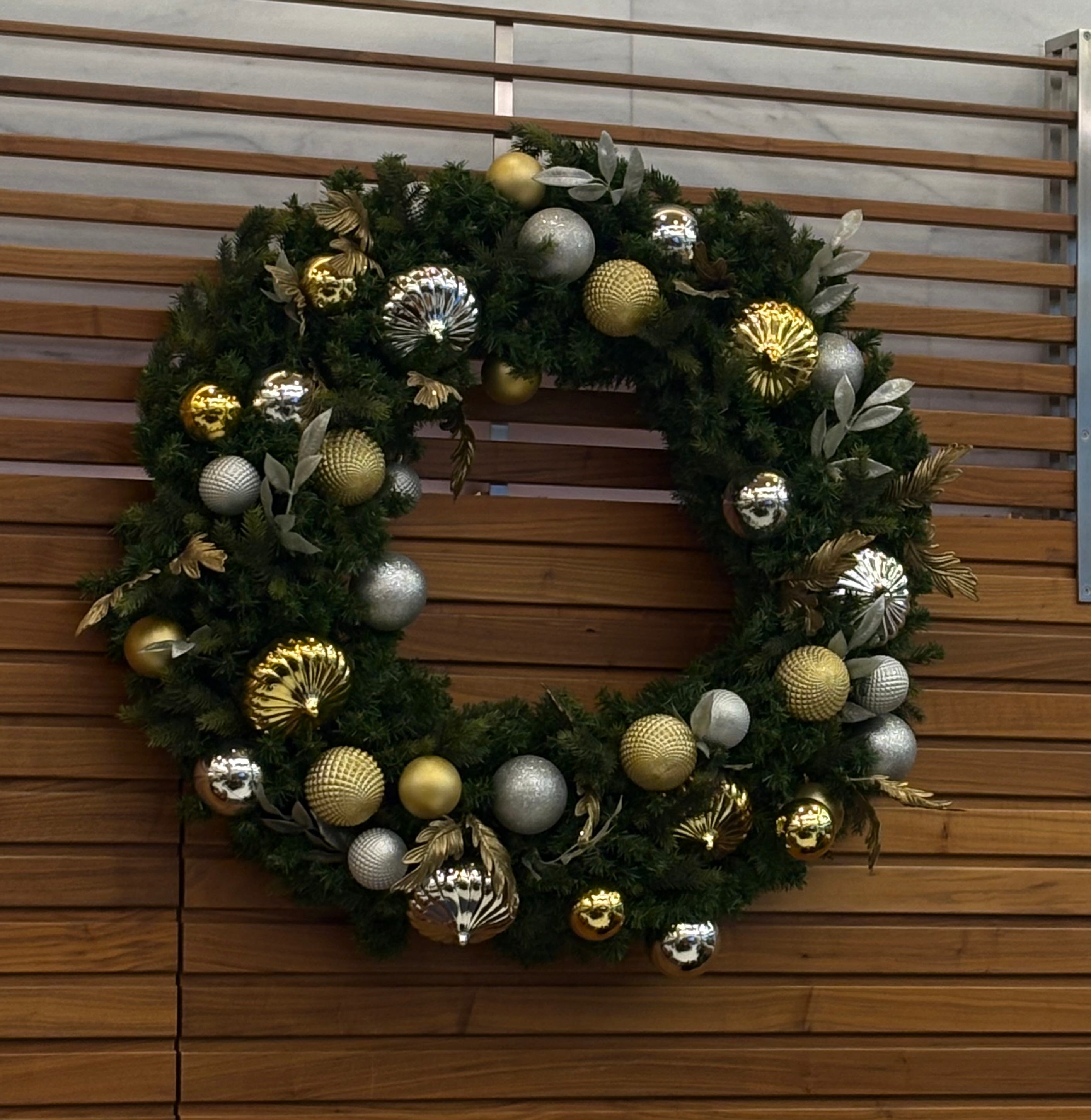A wreath in the waiting area at the Moynihan Train Hall.